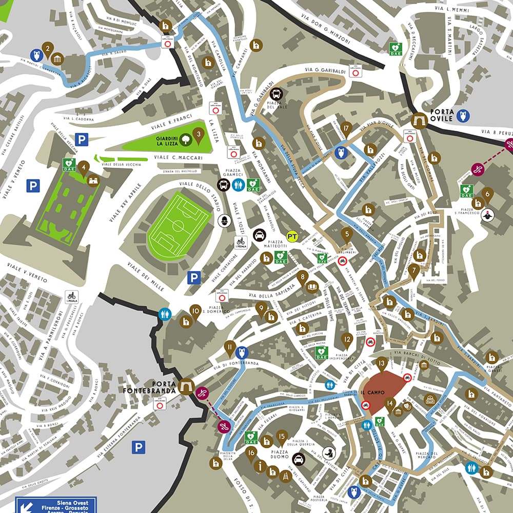 Aiutaci a mantenerlo pulito, rispettalo come fosse un grande "salotto". Non sederti a terra per riposare o mangiare, ma cerca le valli e gli spazi verdi o utilizza la struttura appositamente destinata in Piazza del Mercato (Tartarugone) a un passo da Piazza del Campo. Tutti noi, cittadini di Siena, te ne saremo grati. Buona visita in città.