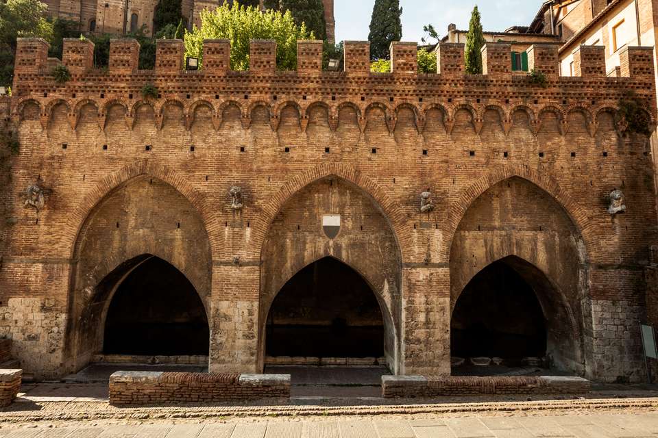 The most famous, the most monumental, the biggest and most important fountain of the city of Siena. The fountain is composed by: three wide ogival Gothic arches topped by merlons, added in modern time; front decorated by four leonine jets and, in the centre, the City's coat of arms called “balzana”, a shield divided in horizontal way, which is white above and black below. Originally the structure of the fountain is the typical one of medieval fountains: a first pool for drinking water, then a second one (now it doesn't exists anymore) as a watering hole for animals, and a third pool for washing clothes. The construction of the first arch to cover the main pool probably dates back to 1193, a date shown on the plaque on the inside, which recalls the Bellamino as executor. Between the thirteenth and fourteenth centuries the source was expanded with the addition of two additional arches alongside the first. Fontebranda is remembered by Boccaccio, by Fazio degli Uberti, by Leandro Alberti and perhaps also by Dante himself. The water arrived from the underground aqueduct of the "Bottini" and then still continued their course along canals that supplied mills, tanneries and dye-works, that were located indeed in the area of Fontebranda, one of which belonged to the Benincasa, family of Santa Caterina da Siena.