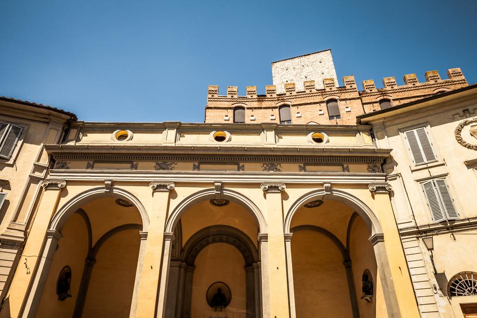 Piazza Indipendenza is a recently formed space. Here in ancient times stood the church of San Pellegrino, mentioned since the eleventh century and completely demolished in the early nineteenth century, after the parochial title was suppressed in 1783. At its side stood the Chapel of the Wool Guild, also demolished in 1777. Part of the space occupied by the church, in 1887 the Loggia dell'Indipendenza was built, a three-arch building designed by Archimede Vestri. Its realization occluded one side of Palazzo Ballati, formerly owned by the Gallerans, whose high tower, also called the Orsa, although it was lowered in 1724 still rises above the loggia itself. Opposite is the Teatro dei Rozzi attached to the homonymous Academy, built as "Congrega dei Rozzi" in 1525 and became the Academy in 1665. The theater was built in the early nineteenth century in the old rooms of the Wool Guild, on project by Alessandro Doveri, and later it was enlarged by Augusto Corbi. The square is starting point for an interesting city itinerary, which includes Via Diacceto (with one of the most beautiful panoramic views on the Basilica di San Domenico and on Via Fontebranda), the Vicolo delle Carrozze, one of the most characteristic for its archivolts, and then Via della Galluzza, steep decline with an unmistakable appearance thanks to the eight counterforce arches which frame it.