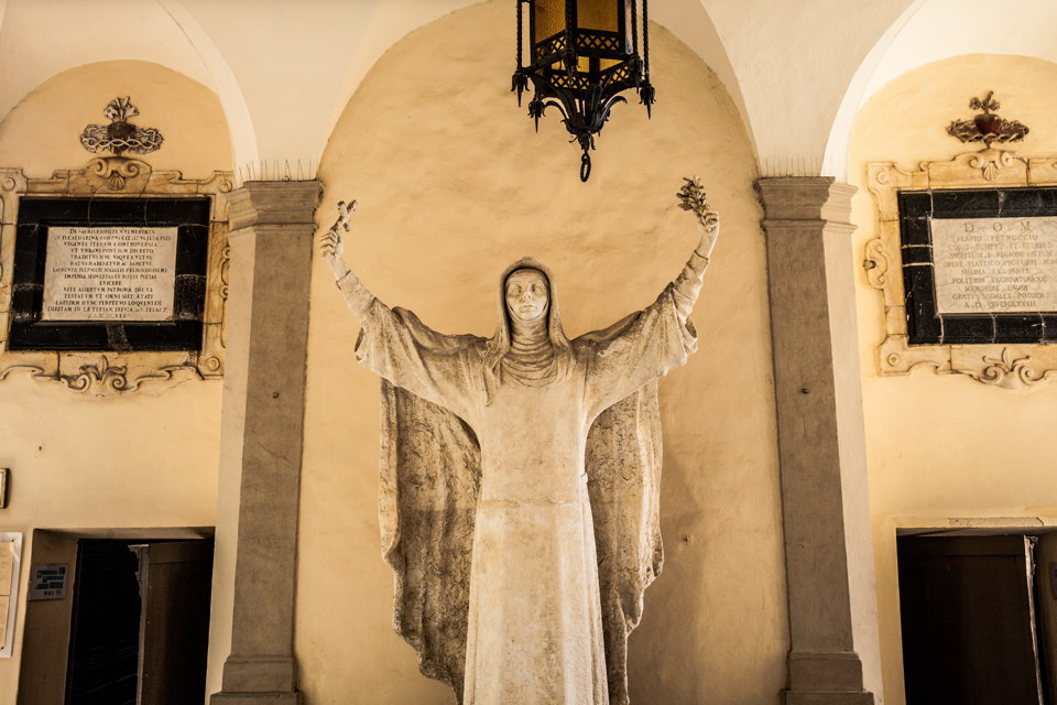 The native house of Santa Caterina da Siena was transformed into a sanctuary in 1464 and you can see there many testimonies about the life of the Sienese. The current entrance is made up by the 'Portico dei Comuni', made in 1941, two years after the proclamation as Patroness of Italy by Pope Pius XII. In 1999 Pope John Paul II also proclaimed her co-patroness of Europe. The 'portico' took this name because every Italian municipality contributed symbolically - with a brick - to its realization. And every year, during the celebrations in honor of Santa Caterina (29 April) an Italian Municipality or an Association offers the oil to fuel the flame of this votive bronze lamp, commissioned by the mothers of the soldiers who died during the Second World War. The Sanctuary consists of various environments: the Chiesa del Crocifisso (Church of the Crucifix) (the artwork from which the Saint received the stigmata in the Chiesa di Santa Cristina in Pisa in 1375), the Oratorio Superiore (Upper Oratory) with beautiful majolica floor, the Oratorio della Camera frescoed in 1896 by Alessandro Franchi, and the Chiesa di Santa Caterina in Fontebranda, with a wooden statue by Neroccio di Bartolomeo and paintings by Girolamo del Pacchia and Sodoma.