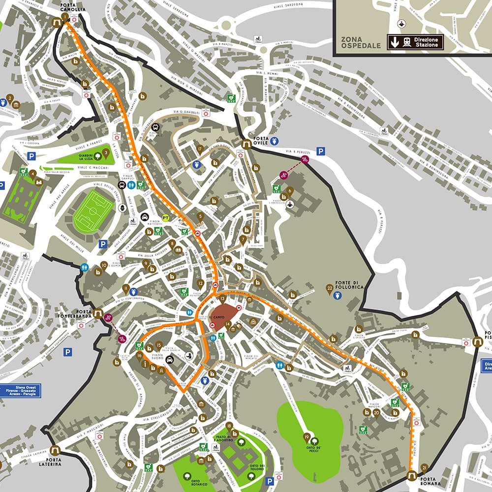 Aiutaci a mantenerlo pulito, rispettalo come fosse un grande "salotto". Non sederti a terra per riposare o mangiare, ma cerca le valli e gli spazi verdi o utilizza la struttura appositamente destinata in Piazza del Mercato (Tartarugone) a un passo da Piazza del Campo. Tutti noi, cittadini di Siena, te ne saremo grati. Buona visita in città.